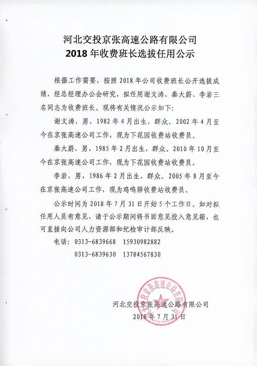 公司2018年收費(fèi)班長(zhǎng)選拔任用公示